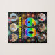 Ce puzzle à thème d'anniversaire gai et excitant design comprend un grand nombre de "60" avec un motif dynamique du spectre arc-en-ciel inspiré, avec le message "HAPPY 60th BIRTHDAY," et un nom modifiable, sur un motif inspiré par éclatant feu d'artifice multicolore célébrations. En haut et en bas, il y a des images qui peuvent être customisées, peut-être avec des photos du destinataire, et/ou de la famille et des amis du destinataire. Un puzzle d’anniversaire customisé et optimiste comme celui-ci pourrait être envoyé pour célébrer le soixantième anniversaire de quelqu’un. (Photographie © Storytree Studios, Stanford, CA.) [~Z0000664]
