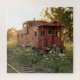An abandoned old red caboose, its faded paint blending harmoniously with the delicate blooms of Queen Anne's lace that surround it