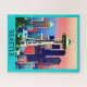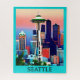 Puzzle dans une affiche de voyage de Seattle, Washington skyline, sous un ciel d'aube, dans les tons turquoise et corail rose