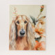 Beautiful and fun jigsaw puzzle for dog lover with a watercolor portrait of an Afghan Hound dog sitting against lovely peach colored lilies flowers.