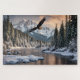 En hiver, un majestueux aigle chauve surplombe une rivière, avec des arbres enneigés et des montagnes glaciaires en arrière - plan. Un puzzle parfait pour tous ceux qui aiment la faune, la nature et l'extérieur.