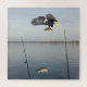 Les amateurs de pêche, les amoureux de la nature et les amateurs de sports nautiques aimeront l'image médiatique mixte d'un aigle à tête blanche américain en vol avec une basse à grande bouche dans ses griffes entre deux bâtons de pêche sur un paysage de Broad Creek, Shiloh, NC.