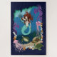 Une sirène aux cheveux roux est au milieu des hippocampes, des étoiles de mer, des tortues, des méduses et des trésors dans un décor bleu