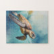 Image aquarelle d'un gros plan d'une tortue de mer nageant dans l'océan. Blues, tan et blanc dans l'arrière - plan