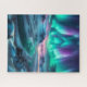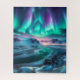 Les lumières nordiques (Aurora Borealis) descendant du ciel sur un paysage enneigé et une rivière menant l'oeil à une ville lointaine s'illuminent dans la nuit vue, par martinspixs.