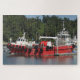 Bateaux rouges vifs dans une marina, avec des arbres verts dans l'arrière - plan.