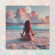 Belle femme méditant sur une plage de sable blanc et de verre de mer brillant. Nuages roses et bleus fluffy et eau bleu pâle.