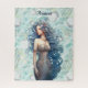 Une belle sirène avec de longs cheveux bleus à flot contre un arrière - plan de turquoise avec un coquillage et un motif frontal.