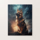 Un majestueux chien berger allemand est assis sur une branche d'arbre, regardant vers le haut avec une expression sérieuse. Sa fourrure est un riche mélange de brun et de noir, mis en valeur par le ciel dramatique et orageux derrière elle. Le ciel est un mélange tourbillonnant de nuages bleu foncé et gris, avec des éclats d'orange et de jaune qui s'émerveillent. Un cadeau idéal pour les amateurs de bergers allemands.