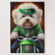 Un ami en fureur derrière les guidons d'une moto verte brillante, portant une tenue verte de la Saint Patrick qui fait tourner la tête. Le chien est habillé d'un ensemble festif, avec une cravate arc-en-ciel verte et un chapeau haut assorti qui se trouve doucement au-dessus de la tête. Le costume présente des motifs complexes de shamrocks et de leprechauns, ce qui indique clairement que ce chien est prêt à célébrer la Saint Patrick avec style.