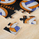 Ce puzzle motif de volley-ball pour filles présente une plus grande artsy bleue, orange et blanche, stylisée volley-ball, sur laquelle son nom et son numéro de maillot peuvent être personnalisés, surplombant un motif de petites volleyballs bleus, orange et blancs sur un arrière - plan noir et "I love volleyball" texte de style lettre de varsity en orange s'étirant entre les rangées de volleyball billes - par katz_d_zynes