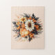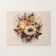 Un puzzle avec un bouquet de fleurs élégant mais goth. Composé de tulipes oranges, marguerites jaunes, feuilles et sprigs gris et quelques accents de baies oranges.