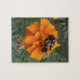 Deux bourdons noirs et jaunes sont assis sur la même fleur de marigold orange sur cette photo prise par Richard H. Fay.