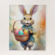 Jigsaw puzzle d'un lapin gai en tenue bleue portant un panier rempli d'oeufs colorés et décorés. L'arrière - plan est décoré dans des tons doux et fleuris, dans des tons doux et chauds.