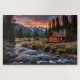 Les lumières brillent à l'intérieur d'un cabine en bois près d'une rivière à écoulement rapide, sous un soleil couchant. Montagnes et forêt à feuillage persistant complètent le décor. Un beau puzzle paysager, parfait pour tous ceux qui aiment la nature et l'extérieur.