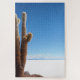 Puzzle denteux vertical d'un cactus géant sur les appartements blancs de sel de Salar de Uyuni en Bolivie.