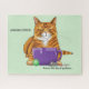Un mignon chat tabby orange assis devant une tasse de café violet dans un arrière - plan de vert