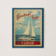 Ce voeu de Camden Maine design voyage nautique vintage comprend un bateau naviguant sur l'eau avec des mouettes et un ciel bleu rempli de somptueux nuages blancs bouffants.