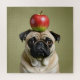 Carlin drôle avec une pomme équilibrant sur le dessus de sa tête.