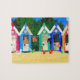 Un puzzle denteux avec une rangée des huttes et des mouettes colorées de plage, d'un collage de papier peint à la main par Judy Adamson. D'autres produits et cartes de voeux avec cette conception sont disponibles dans mon magasin.