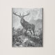 Belle illustration vintage en noir et blanc de cerfs dans les hautes montagnes. Un cerf mâle aux bois est suivi de deux autres cerfs sur le flanc d'une montagne avec des montagnes au loin. vers 1890 Thiele