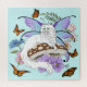 Un joli chat blanc aux ailes de fées assis sur un champignon avec des fleurs sur fond de bleu vif