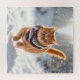 Chat-gingembre courant dans des flocons de neige avec une écharpe d'hiver.