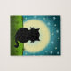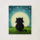 Petit chaton noir assis sur la pelouse herbacée, regardant la lune brillante. Le ciel nocturne bleu foncé est parsemé d'étoiles bleu pâle et jaune pâle et éclairé par la lumière lune vive.