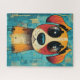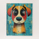 Ce dessin présente une illustration de chien colorée avec de grands yeux innocents. Ce design est composé d'un arrière - plan bleu, et c'est un excellent choix pour les amoureux de les chiens.