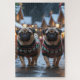 Ce design festif capture l'esprit joyeux de la saison des fêtes, avec des chiens adorables. Installés dans un univers hivernal, avec un sapin de Noël décoré et des cadeaux joliment emballés. Les flocons de neige tombent doucement, ajoutant une touche de magie à la scène, tandis que les couleurs vives des décorations de fêtes créent une atmosphère chaleureuse et gaie.
