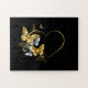 Cadre en forme de coeur d'or, décoré d'or, de bijoux et de papillons blancs sur arrière - plan noir.