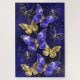 Composition des luxueux papillons saphir et bijoux en or sur arrière - plan bleu texturé.
