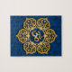 Un symbole jaune lumineux d'Aum se repose à l'intérieur d'une fleur de lotus stylisée. Le motif circulaire est accentué pour créer un éclat léger sur la surface qui se repose sur un arrière - plan bleu profond. Six feuilles élégants atteignent du centre de la conception pour créer un beau motif symétrique. Cette conception unique de puzzle est une représentation saisissante de ce symbole spirituel.