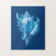 Puzzle dans une vie marine vintage illustration d'une coquille de conque, numériquement rehaussée et colorée dans les tons bleu et blanc, contre un profond arrière - plan bleu indigo