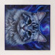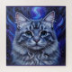 This puzzle features a vibrant, colorful painting of a cat's face. The cat is a grey tabby with striking blue eyes. Its fur is detailed with various shades of grey and white, creating a textured appearance. The cat has long whiskers extending outwards from its nose. The background is a swirling, abstract depiction of a night sky or cosmic scene, dominated by shades of blue and purple. There are flame-like shapes and small white dots resembling stars scattered throughout the background. Above the cat's head, a bright, curved blue light emanates upwards, adding to the fantastical and ethereal quality of the artwork. The painting style appears to be somewhat impressionistic, with visible brushstrokes and a focus on capturing light and color. The overall impression is one of magic and wonder, with the cat appearing as a celestial or mystical being. Finished as an oil paint art print.