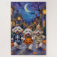 Adorable Bichon Frises habillé de costumes d'Halloween ludiques portent des seaux citrouilles tout en trompant ou en traitant sous le ciel illuminé par la lune. Ce design festif met en valeur le manteau blanc moelleux de la race, l’esprit gai et la personnalité affectueuse, capturant parfaitement l’atmosphère éffrayante et amusante de la nuit d’Halloween. Une charmante fête pour les amoureux de les chiens comme pour les fans d'Halloween.