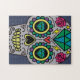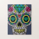 Crâne à sucre Art. Style mexicain Day of the Dead sur le thème de l'art créatif. Image crânienne humaine créée par la combinaison de formes abstraites et de motifs de différentes couleurs sur une image de base principalement grise. L'image évoque des souvenirs de la puissance des fleurs, de la culture hippie ou de l'imagerie gothique rock star.