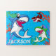 Ce joli dessin animé dessiné sur le requin est idéal pour les amoureux des requins dans votre vie. Ces requins bleus, rouges et verts rendront la construction de ce puzzle plus amusante pour les enfants, garçons et filles. Le nom du texte blanc et bleu est personnalisable !