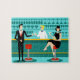 Every hour is happy hour with this Retro Cocktail Puzzle. The mid century design moderne a vibrant, style 1960, minimaliste, cartoon drawing of a classy, cocktail. Against the backdrop of an aqua wall, we can see rows of glasses. At least we can see the teal silhouettes of drink glasses. Judging from the shapes of the stemware, this bar is equipped to wet your whistle, whatever your drink preference. A most competent and personable barders is manning the teal bar with yellow accents. The Young barkeep is wearing a pristine, white shirt with black bow tie. His fresh-faced good looks, blond hair and black hipster glasses give us every reason to n'importe qui a donné des dons his days as struggling actor or a superhero. In one, the handsome mixologist is handing a martini to a customer on the opposite side of the bar. The waiting customer is a broad-shouldered gentleman in a black suit and red tie. He's the ort of fellow who is described as tall, dark, and handsome even when it's still hours until closing time. There seems to be a red and chrome bar stool with M. Debonair's name on it. Yet, not to be presumptuous, he asks the question, "Pardon me. Est-ce que c'est la prise ?" Hé, le raven haired gal on the neighboring bar stool. She's a real "girl next door type", if you hannes to live next door to a flawless beauty with a that won't quit. She is wearing a black dress and holding a martini in one. She's hoping that she and the approaching gentleman have more in common that their drink preference and choice of wardrobe color. It looks like this evening just got interesting Cheers to you !