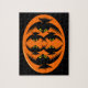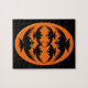 Ce superbe puzzle Halloween design présente un ovale orange avec six corbeaux dedans. Chaque corbeau a des yeux jaunes avec des élèves noirs et des ailes étirées. Les corbeaux volent vers l'autre formant une forme ovale. L'arrière - plan est noir.