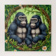 Une représentation artistique de deux gorilles présentée dans un cadre circulaire décoratif entouré de bambous luxuriants, de fleurs et de verdure, mettant l'accent sur la nature tropicale et la beauté de la faune.