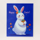 Colorful white Easter bunny with a bow, holding an egg on a blue field with spring flowers