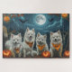 Libérez l'esprit éffrayant avec ce design d'Halloween étrange avec une meute de chiens sous un ciel sombre et clair de lune, entourée de chauves-souris volantes et de citrouilles brillants. Parfait pour ceux qui aiment une touche de plaisir effrayant avec leurs amis en fureur !