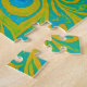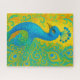 Cet élégant puzzle nature paon vous donnera des heures de plaisir. L'oiseau est aux couleurs turquoise, verte et bleue sur un arrière - plan à motifs jaunes. Image générée avec AI.