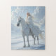 An elven queen with long white hair sits astride a majestic white horse in a vast snowy landscape in this digital artwork created by artist Jayne Wilson.