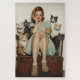 Un portrait à la vintage, une jeune femme joyeuse assise sur un coffre vintage, entourée d'un adorable assortiment de chats. Habillée d'une robe florale rétro et de bottes robustes, son sourire ludique et les compagnons de chats excentriques apportent charme et humour à la scène, célébrant la joie de l'obsession féline.