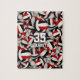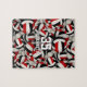 Ce puzzle rouge et noir de l'équipe de volley-ball couleurs pour les filles ou les garçons présente un motif apparemment sans fin de volley-ball de tailles et de profondeurs différentes, tourné dans tous les sens - certaines des balles de volley ont des panneaux rouges et noirs - personnaliser avec le nom du joueur de volley-ball et son numéro de maillot - par katz_d_zynes