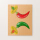 Ce superbe puzzle comporte une paire de piments, un piment rouge et un piment vert. Ils ont tous deux les yeux noirs et la bouche rose. Chaque chili porte un casquette sombrero qui a un crâne de la couleur opposée au chili sur elle pour célébrer la fête mexicaine de la mort, Dia De Los Muertos. Le sombrero contient également trois fleurs avec alternance des pétales rouges et verts représentant le drapeau du Mexique.