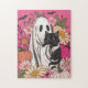 Ce mignon puzzle d'halloween présente un charmant fantôme qui clignote un chat noir aux yeux larges, entouré de flancs d'automne fantaisistes, de citrouilles et de chauves-souris clignotantes — le tout dressé contre un arrière - plan rose audacieux. Ce design mignon et décalé mêle des vibes de saison éffrayantes avec le charme du cottage et le flair girly, parfait pour toute personne qui aime Halloween avec un côté de fleurs et de plaisir.