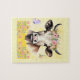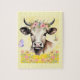 Magnifique puzzle de vache avec une vache avec des fleurs, papillon et libellule, sur un arrière - plan jaune de beurre. Très agréable pour quelqu'un qui aime les vaches.